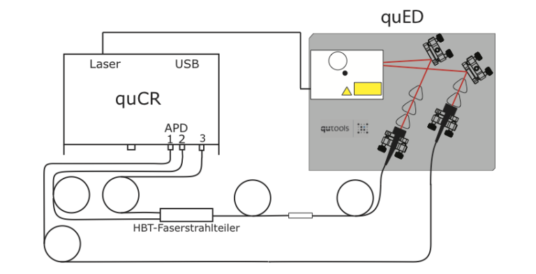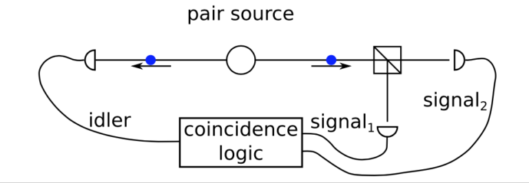 O sursă de conversie parametrică spontană în jos (SPDC), precum quED, nu funcționează ca o sursă reală de fotoni individuali, ci ca o așa-numită sursă de fotoni individuali „heralded”. Aceasta generează perechi de fotoni. Datorită conservării energiei și impulsului, se produc întotdeauna perechi, astfel încât atunci când vedem un foton într-un braț, știm că există un foton și în celălalt braț. Pentru a demonstra acest lucru, folosim un braț al quED ca declanșator (heralding existența fotonului în celălalt braț) și realizăm experimente cu fotoni individuali cu al doilea braț. Experimental, analizăm doar coincidențele dintre aceste brațe: