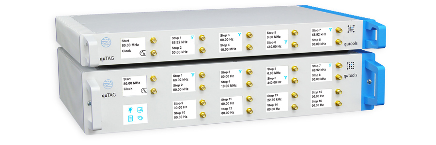 time tagsThe quTAG MC is designed for a high number of simultaneous measurements with up to 32 channels in one device and the ability of synchronizing multiple devices. The device supports multiple start and stop channels, advanced hardware control, and digital interfaces for connecting to various equipment, facilitating precise synchronization between multiple signal sources.